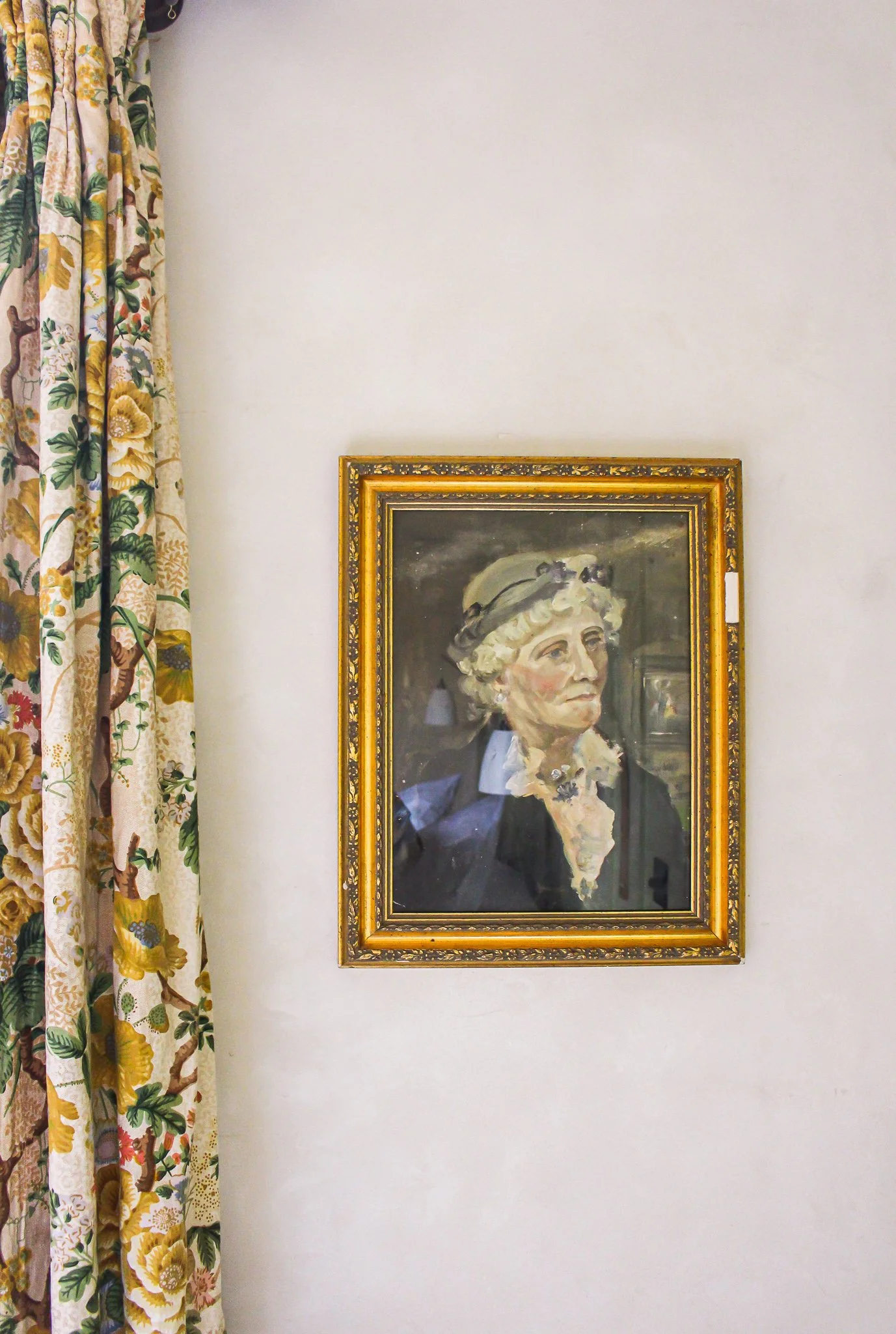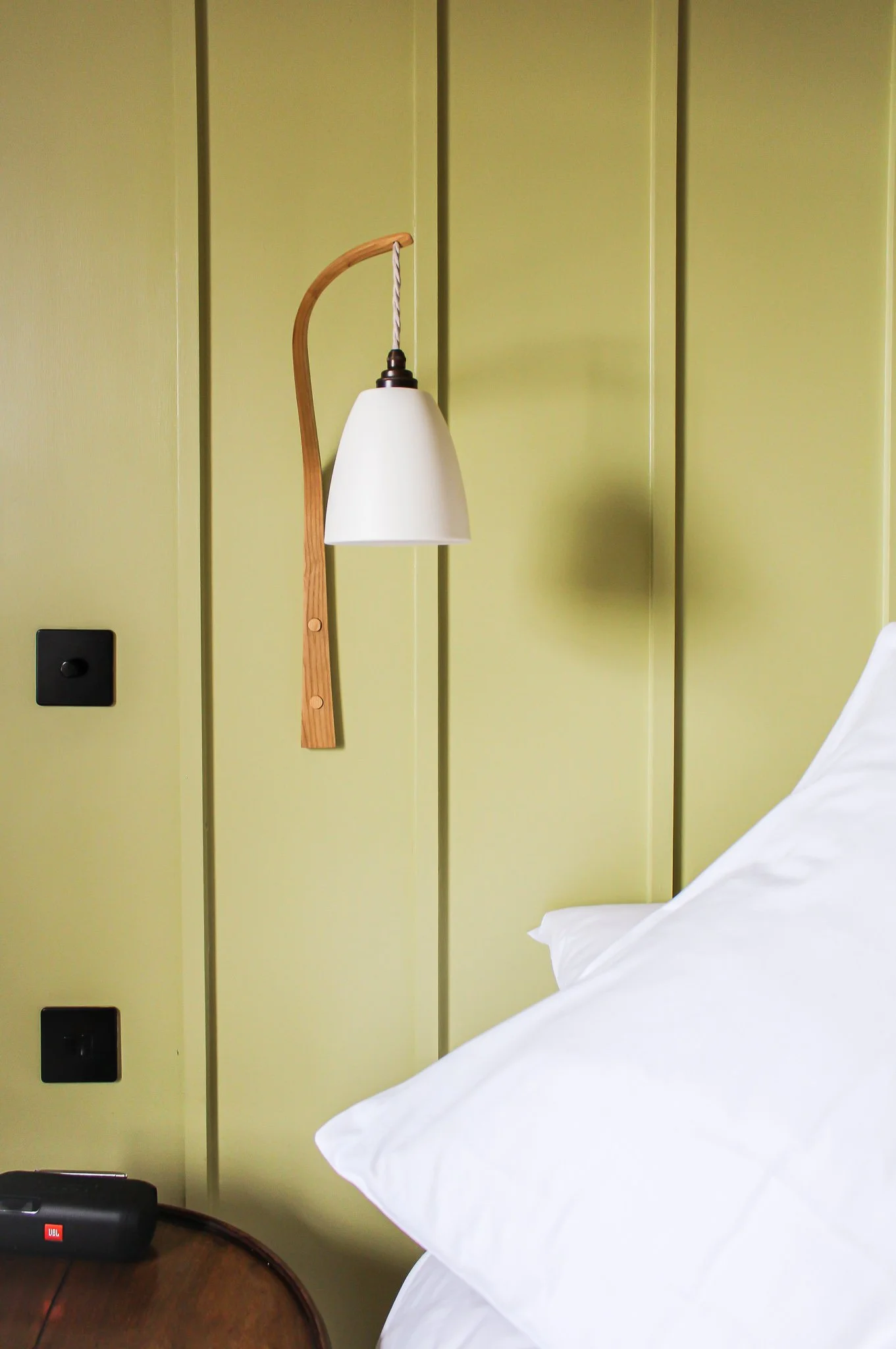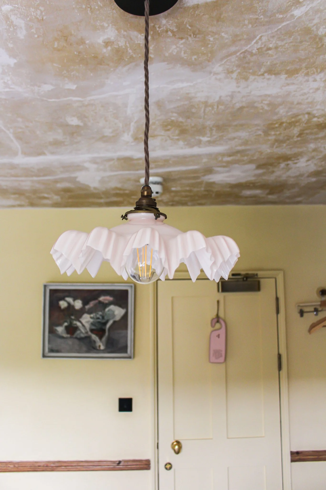 Overlooking the Rotherfold Square, with double bay windows bringing in light through both the bedroom and bathroom, Room No. 4 holds a Super-King Bed, which can be split into a Twin, making this a comfortably large Double room. Featuring the original lath and plaster ceiling and lime panelling beside peachy lemon yellow walls, Room No. 4 also has an exposed fireplace and original in-built glass cabinet which bring out the rooms’ bespoke wooden features. The gorgeous En Suite Bathroom features tiled walls, reclaimed lace curtains and original plastered walls with details of old wallpaper shadows which sit alongside the bathtub.