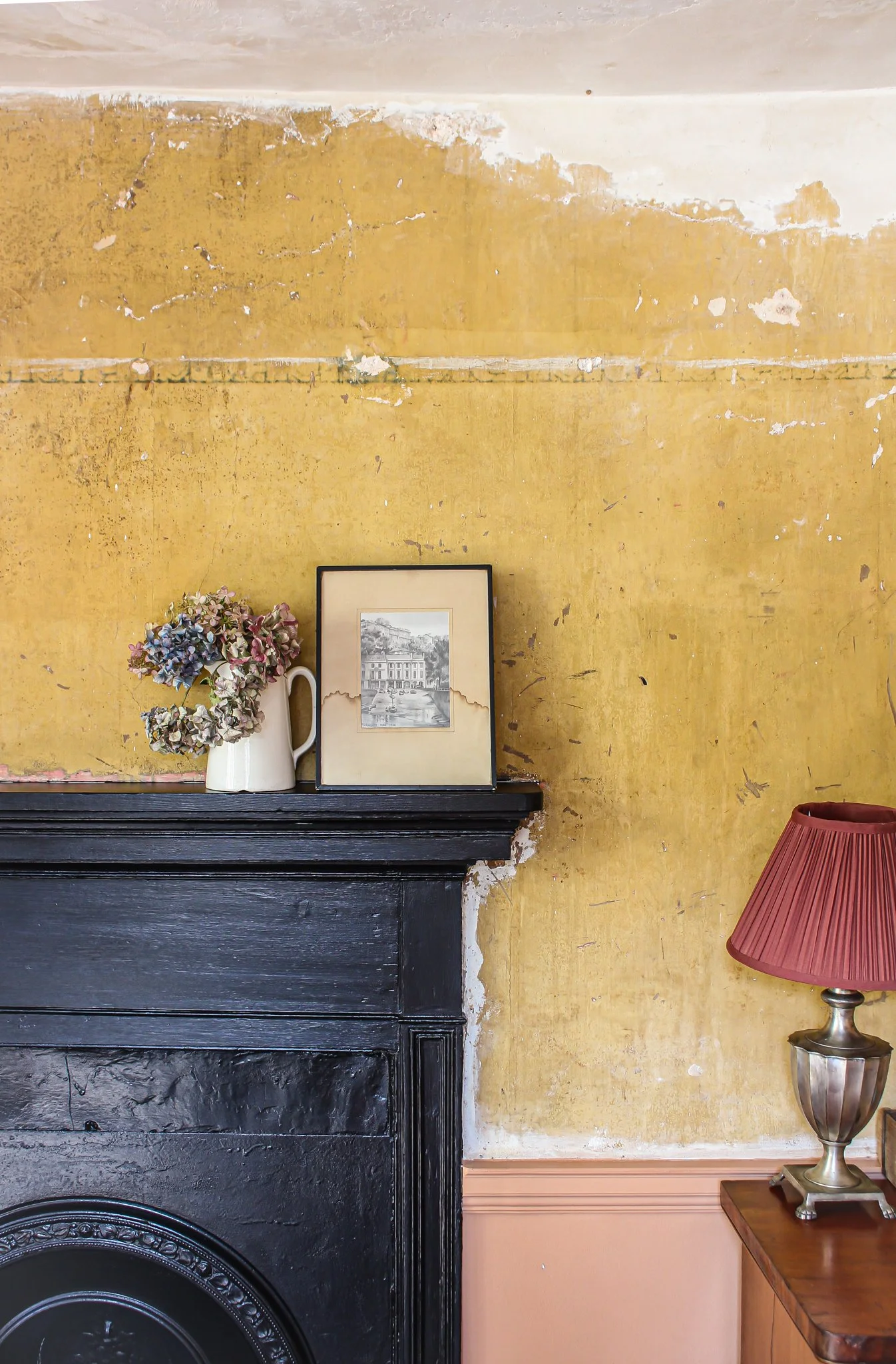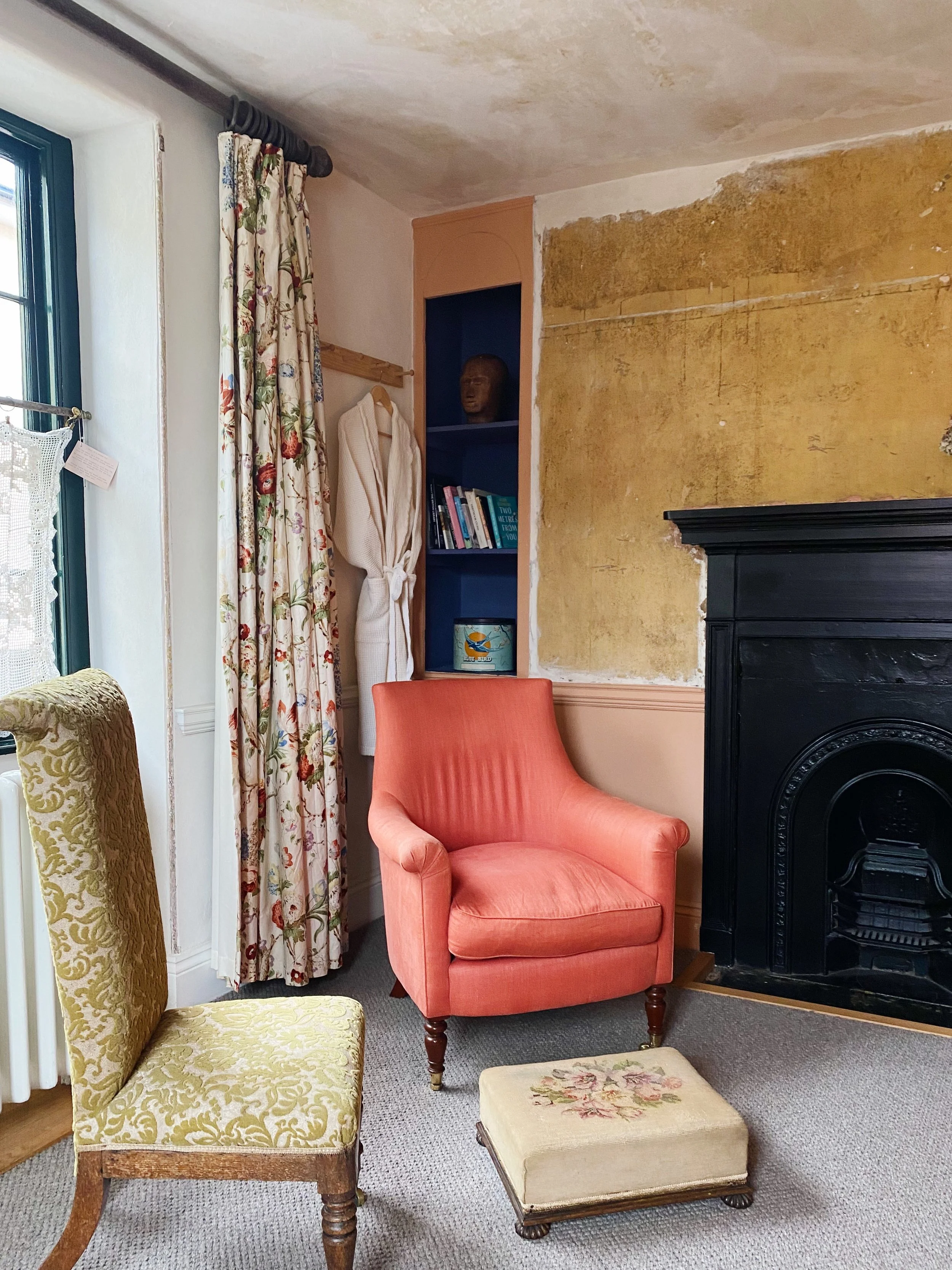 Room No. 5 sits on the corner of the Rotherfold Square, both South and West facing with views heading up the street towards hillside ruins and cows grazing in the fields. One of our largest Double Rooms with a Super-King Bed, or split to make a Twin, there is an extra ottoman, suitable for a child’s bed, available and space for a cot. The walls have been exposed to reveal raw ochre plaster, sitting against rose panels and an adjoining En Suite Bathroom with handmade tiles, citrus linseed and hemp flooring and tub. With a large mahogany dresser and in built navy nooks, there is plenty of storage space, as well as a Victorian exposed fire place, desk and re-upholstered armchairs to relax in.