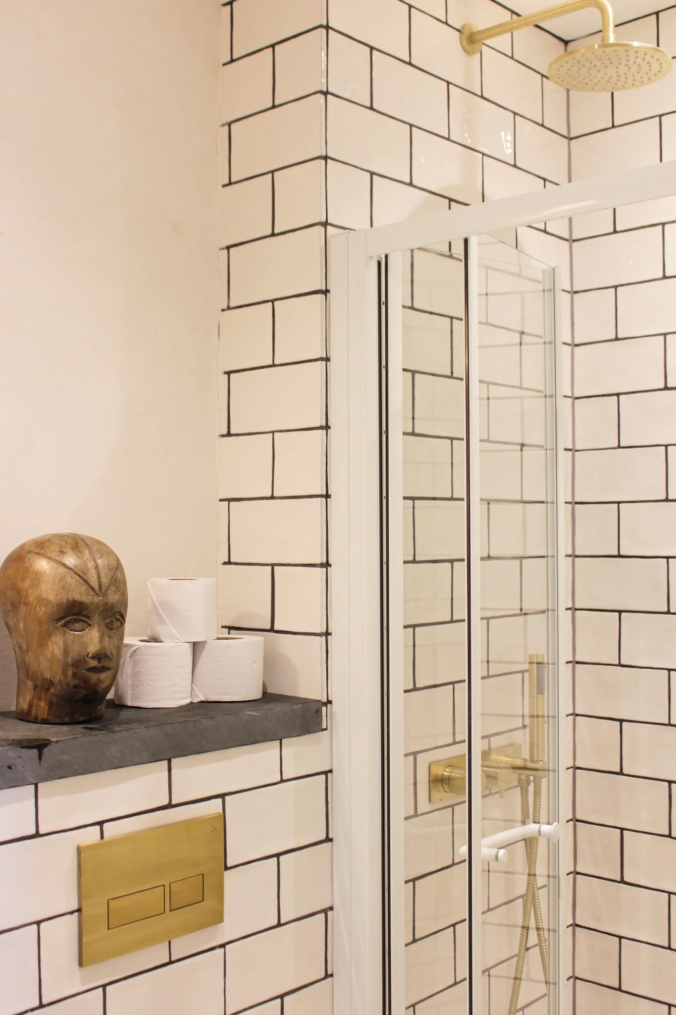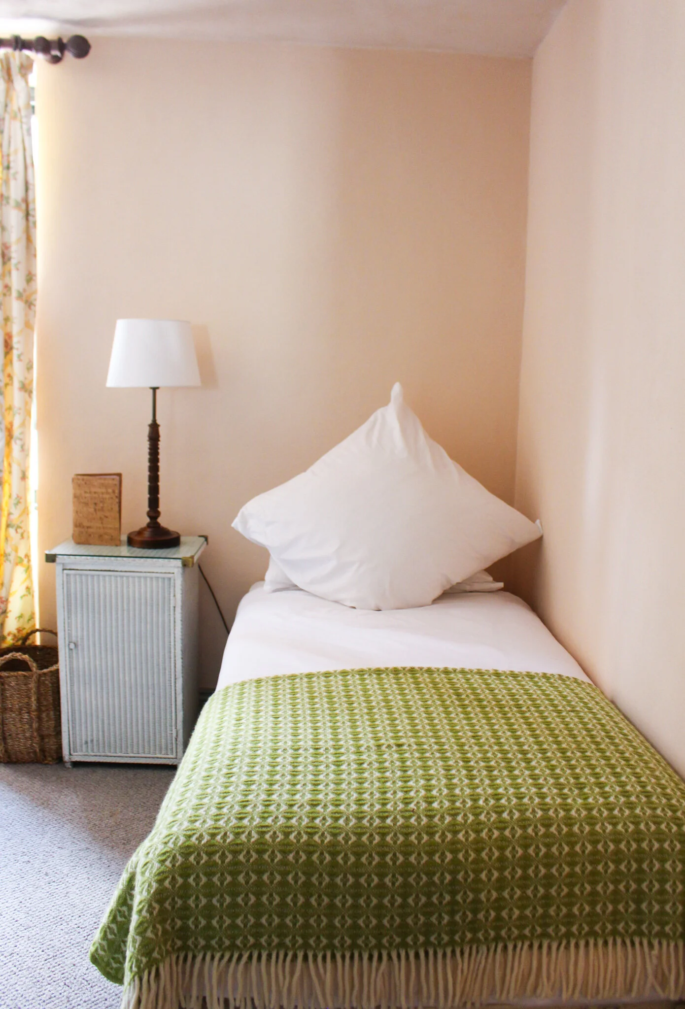 Tucked away in the heart of the building, Room No. 6 is the perfect hideaway for a solo travelling trip to visit Totnes, or for the younger ones to stay separately. Peachy plaster pink walls are paired alongside warm wooden features and a reclaimed fireplace and mantel. Behind the sliding sage blue door, sits a white, tiled shower room and features such as handmade wooden pegs and vintage curtains dotted throughout the room. With a trundle bed, you can pull out the second bed for teenagers to snuggle up alongside the single, ready for sleepovers in a room apart from parents as the perfect addition for a family stay down in Devon.