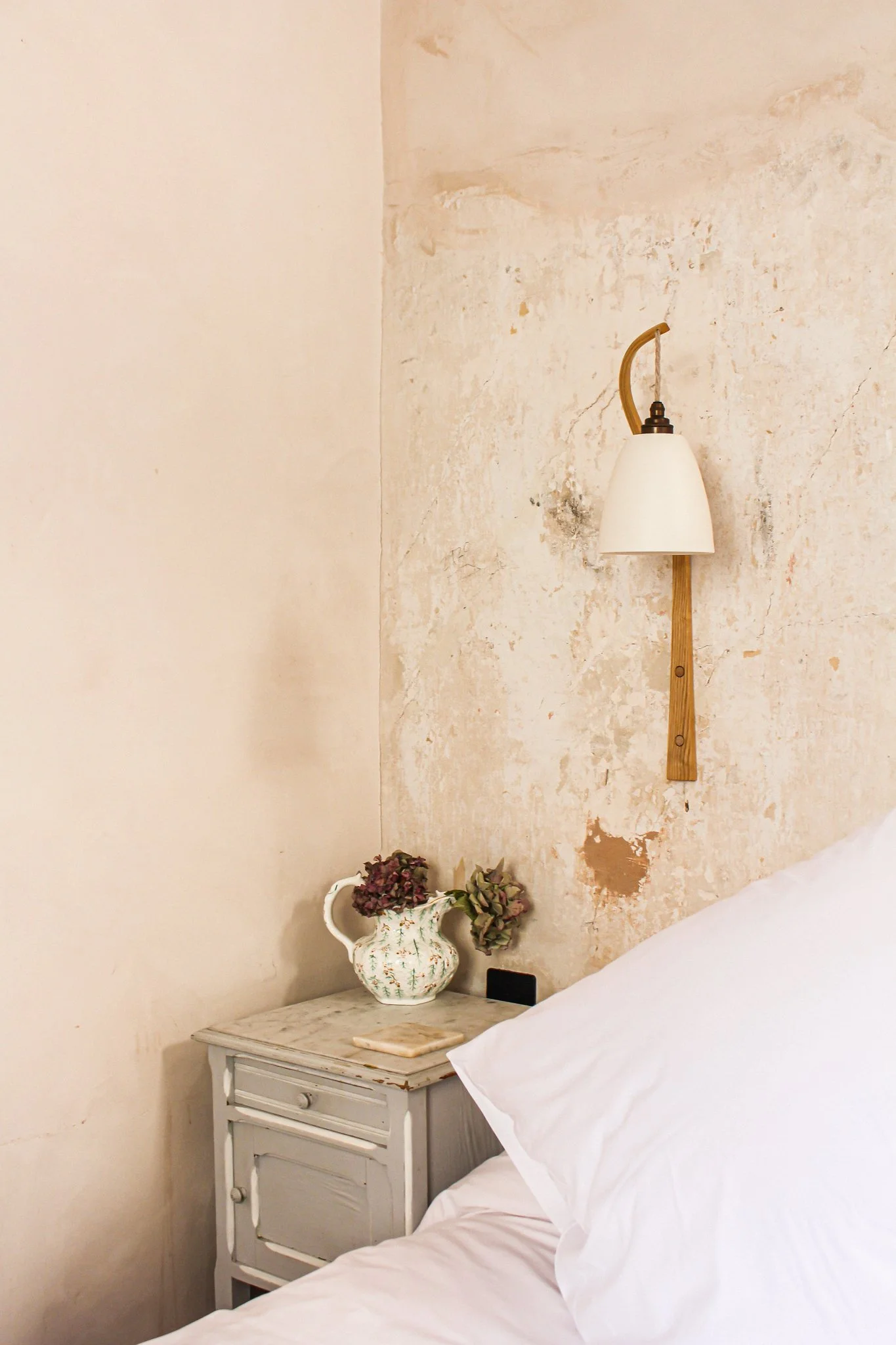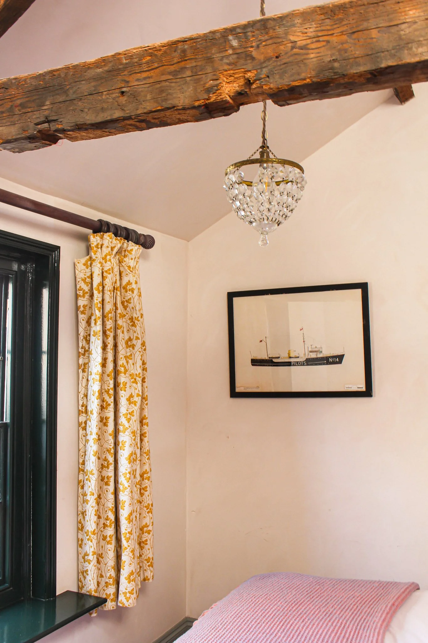 Exposed beams sit alongside plaster walls in Room No. 8’s Super-King room. With bespoke light wells in the bathroom and entrance, the beautiful high ceilings make space for features such as a floor to ceiling length vintage linen curtain, bottle green bay window frames, hidden doors and crystal shades. The En Suite Shower room features an oval, wooden mirror and slate counter-top, a perfect quiet and calm room to hide away in.